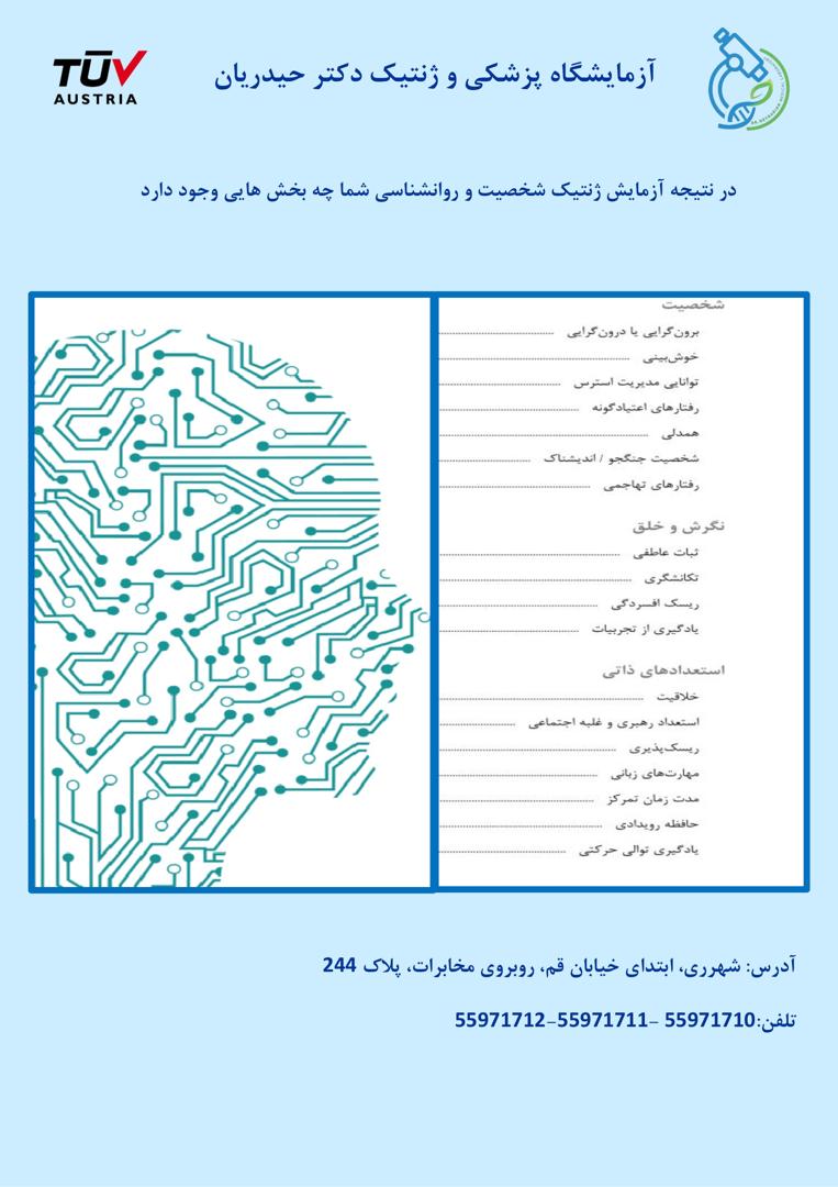 تست شخصیت و روانشناسی، نتيجه بررسى ژن هاى مرتبط با ١٨ ويژكَى شخصيتى، خلقوخو و قابليتهاى شماست. اين اطلاعات به شما كمك مى كند احساسات، انگيزه ها و رفتارهاى خودتان را بهتر بشناسيد.